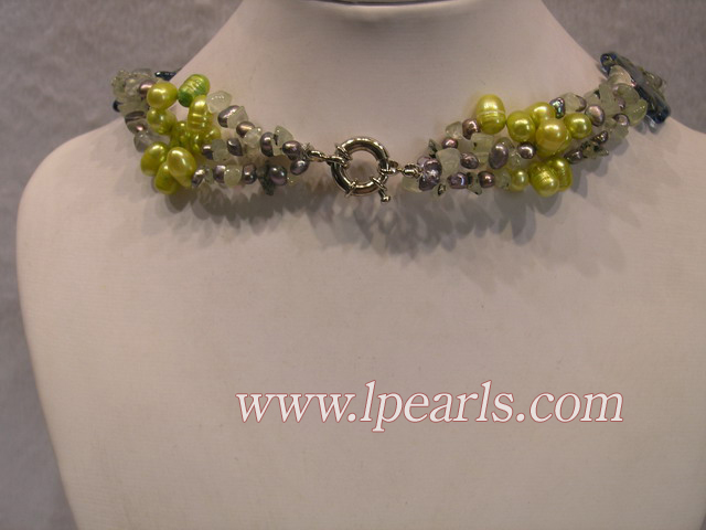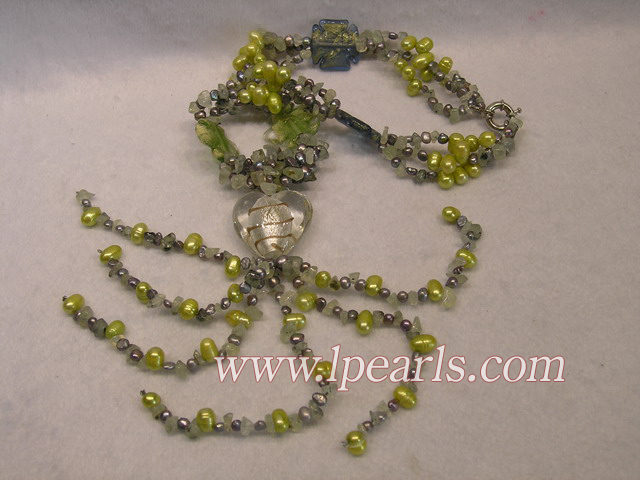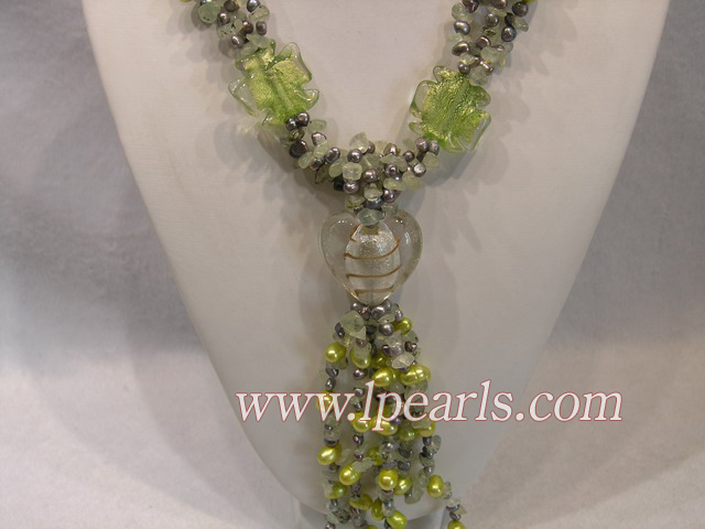 Three strands heart shape glaze braid pearl necklace; accessoried with 7-8mm side-drilled yellow pearls, 4-5mm black double shiny pearls, unshaped green crystal beads in space; threaded through four special shape glazes with six pearl braids dangling on a clear heart glaze; ended with silver clasp. The wearable length is 20"and weight is 192g. It's so fascinating!